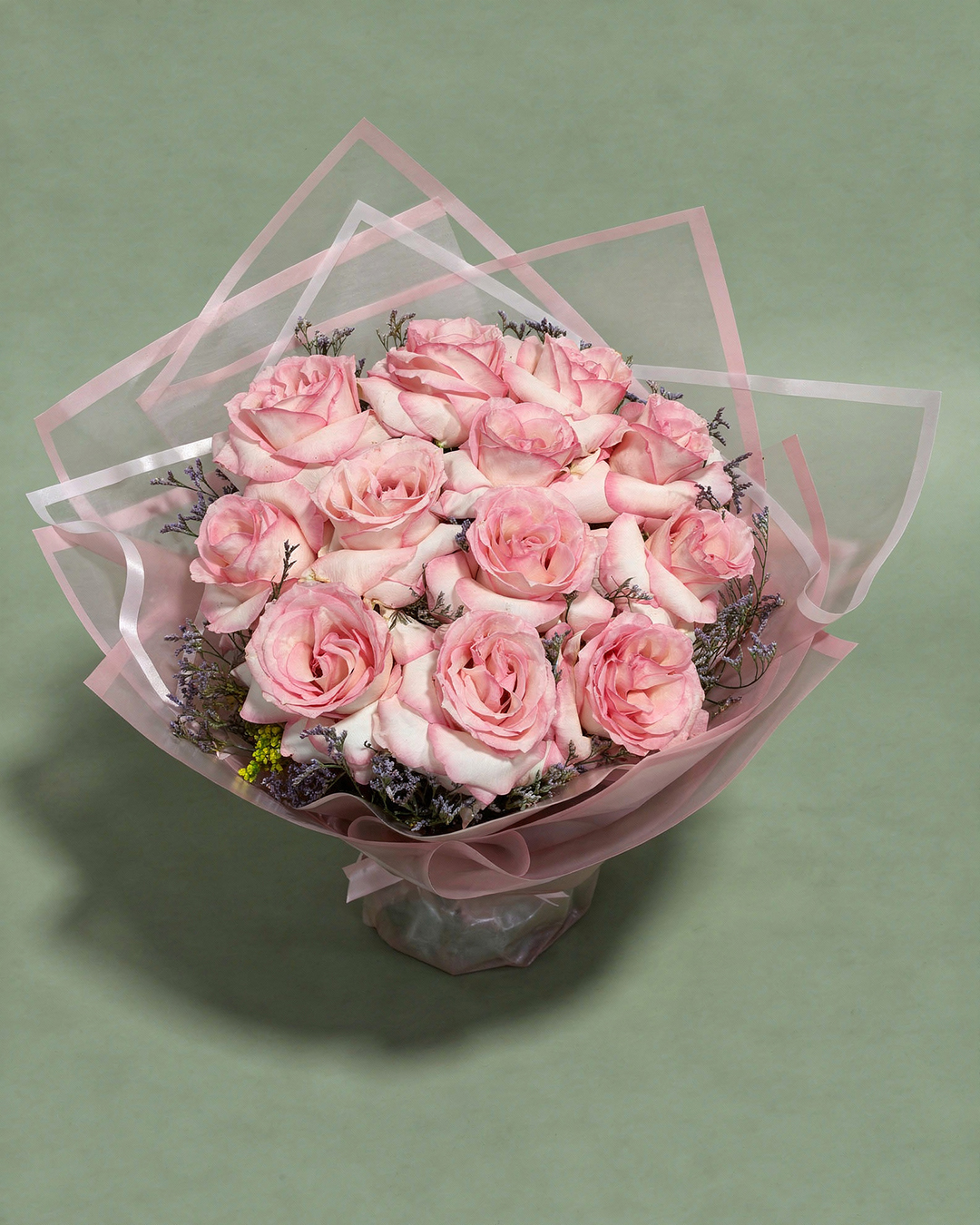 باقة ناعمة مليئة بدرجات الوردي الهادئ بتنسيق دائري كثيف يمنحها حضورًا أنيقًا ومظهرًا مترفًا. الوردات كبيرة ومفتوحة بشكل جميل، مع لمسات خضراء خفيفة وفواصل طبيعية تضيف عمقًا للتصميم دون أن تسرق التركيز من الزهور.