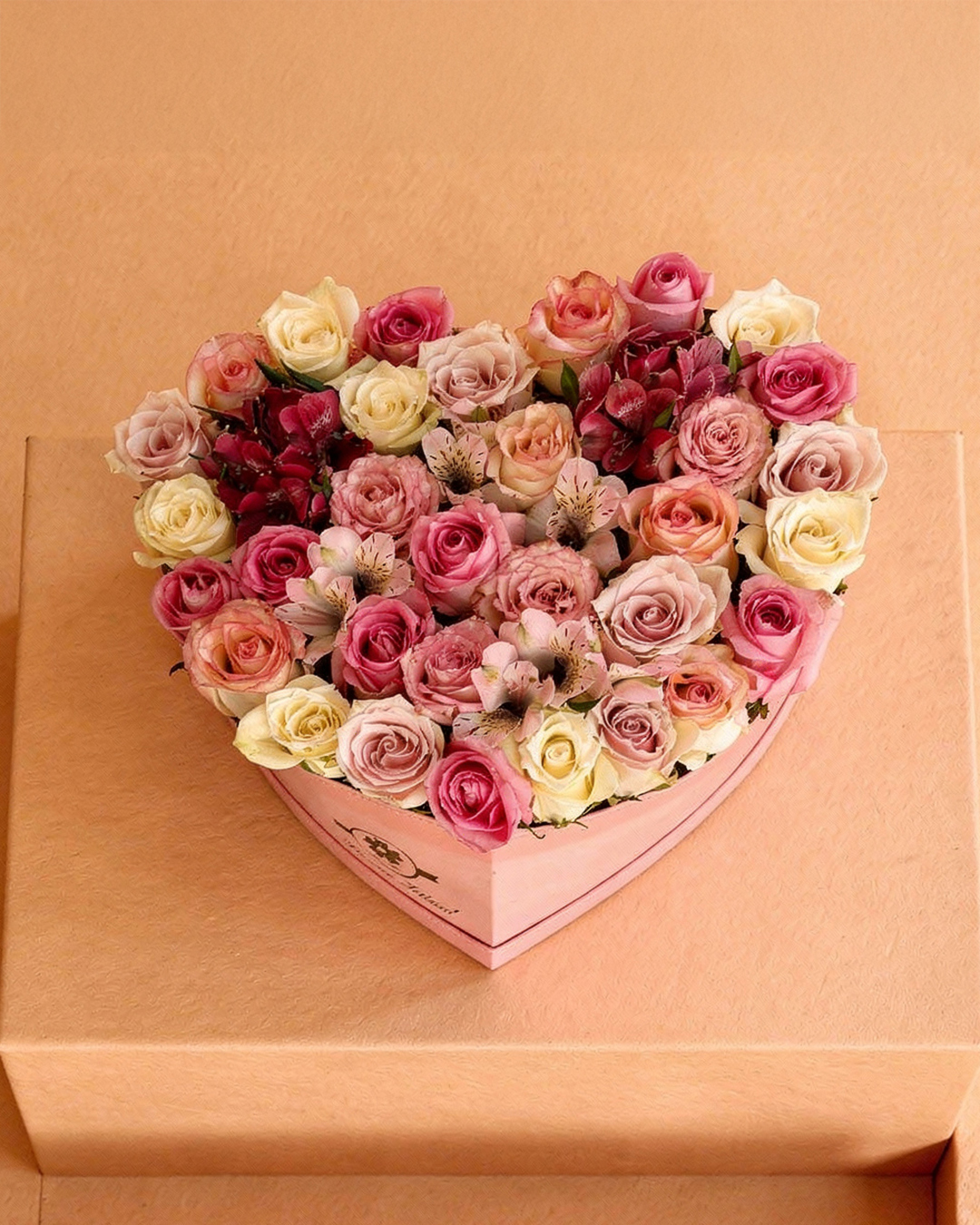 الزهور مرتبة بكثافة داخل صندوق على شكل قلب يمنح الهدية طابعًا رومانسيًا واضحًا، ويجعلها مثالية للمناسبات الخاصة.