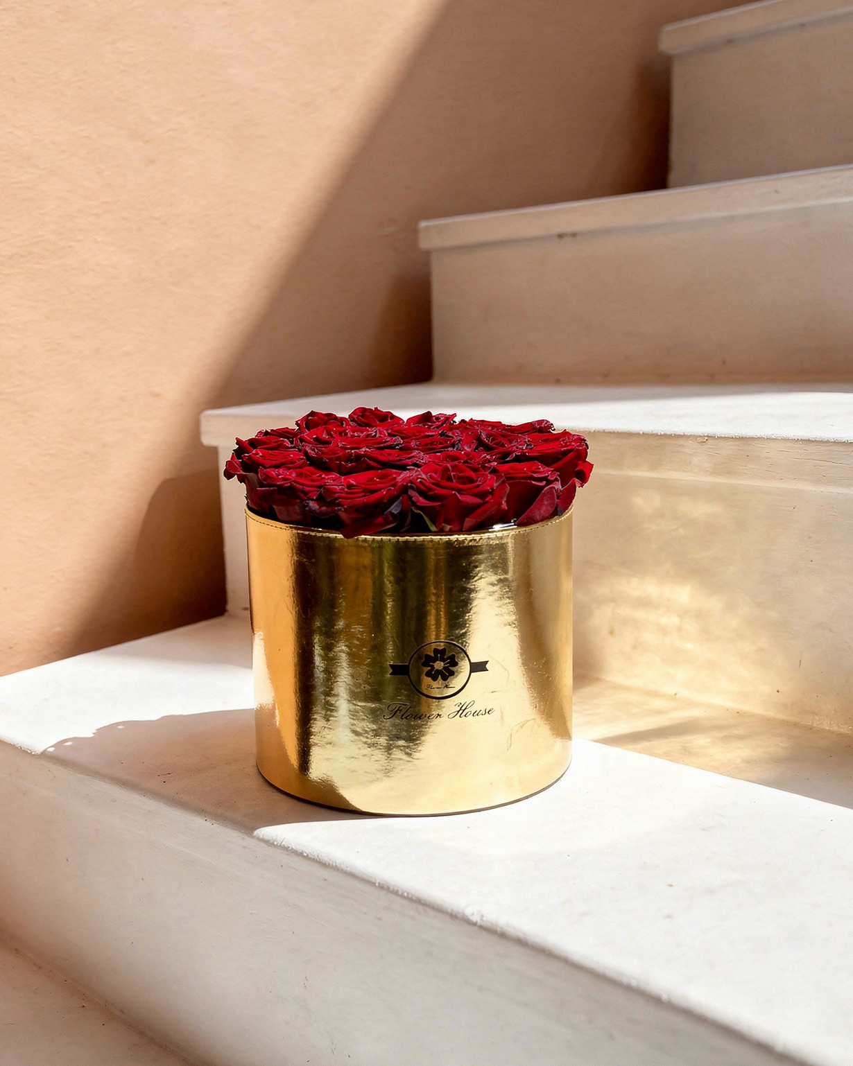 الصندوق الأسطواني باللون الذهبي اللامع يمنح الهدية طابعًا فخمًا مناسبًا للمناسبات الكبيرة والهدايا الراقية.