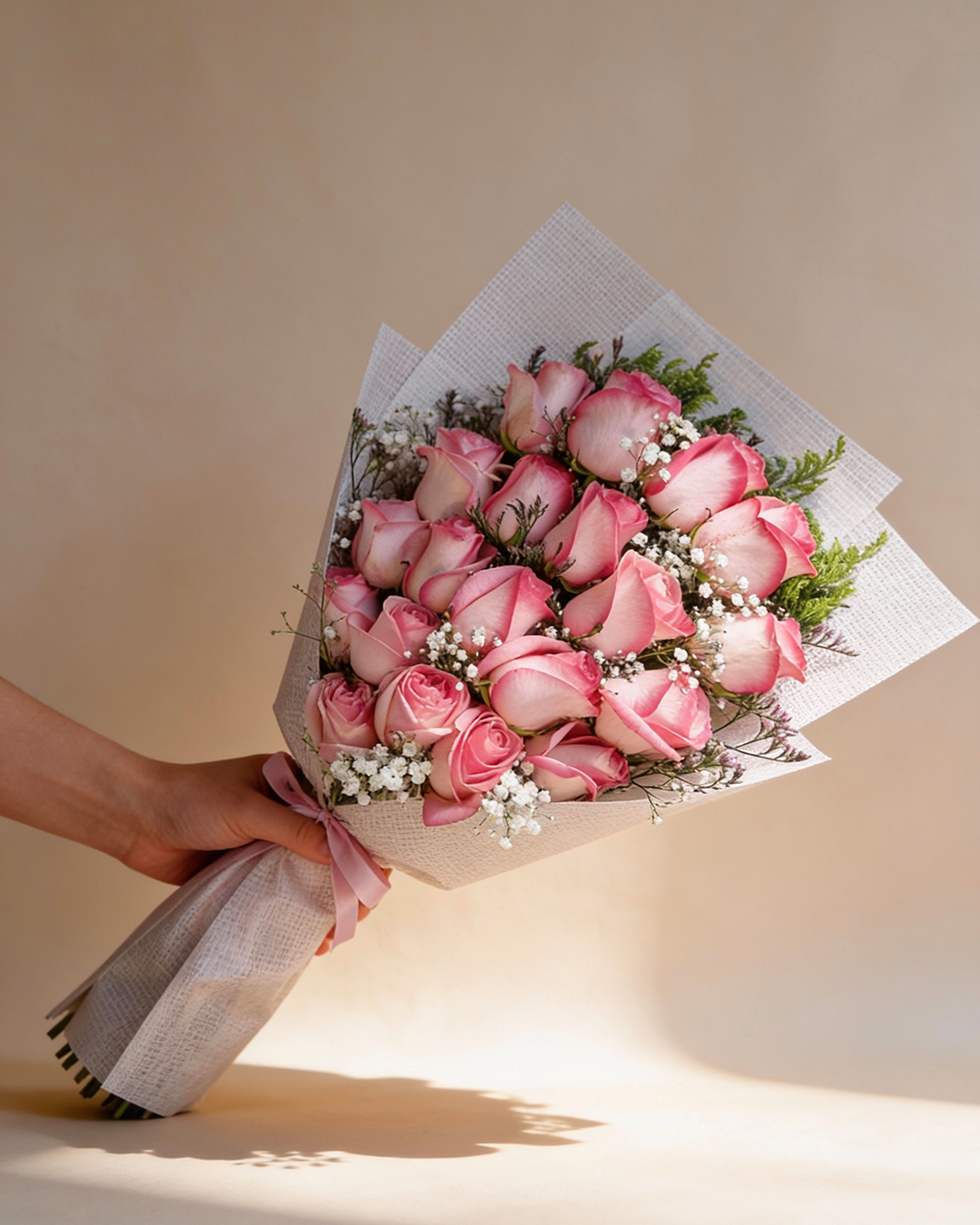 التغليف مصنوع من ورق شبكي أبيض يمنح الباقة طابعًا عصريًا راقيًا، مع ربطة شريطة وردية ناعمة تكمل الإحساس الرومانسي وتزيد من أناقة الشكل النهائي.