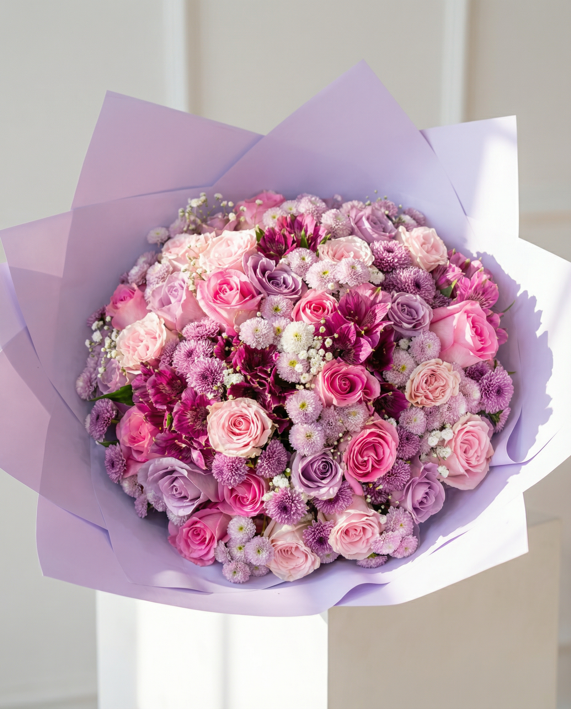 تنسيق فاخر وممتلئ يجمع بين الورد الجوري بدرجات الوردي مع لمسات من البنفسجي وأزهار صغيرة متنوعة، موزعة بشكل دائري كثيف يمنح الباقة مظهرًا غنيًا وأنيقًا يعكس الرومانسية والتميز.