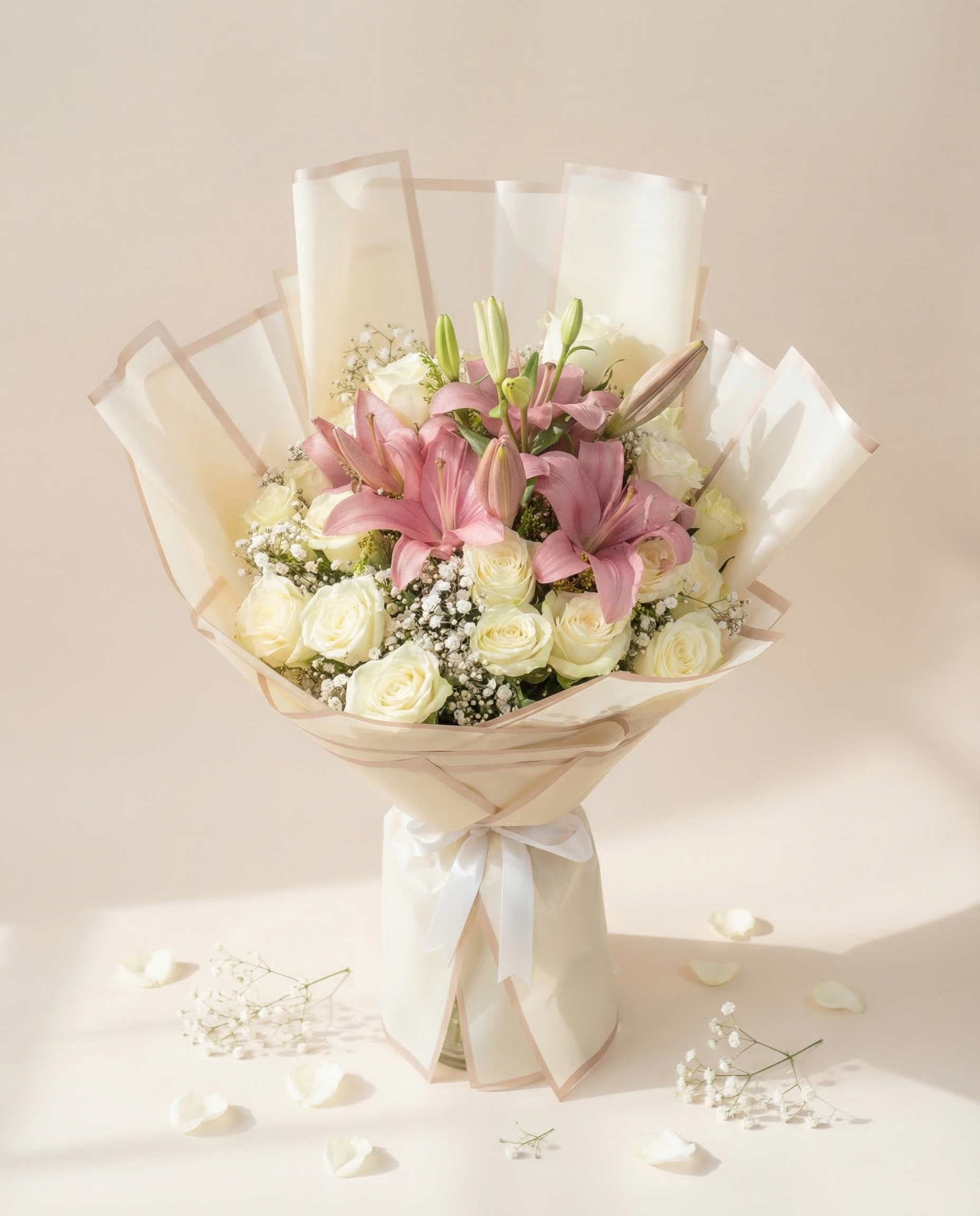 تنسيق أنيق يجمع بين زهور الليليوم الوردية المتفتحة في المنتصف مع الورد الأبيض المحيط بها ولمسات من الجبسوفيلا الناعمة، ليعكس مزيجًا راقيًا من الرومانسية والنقاء في باقة متناسقة وجذابة.