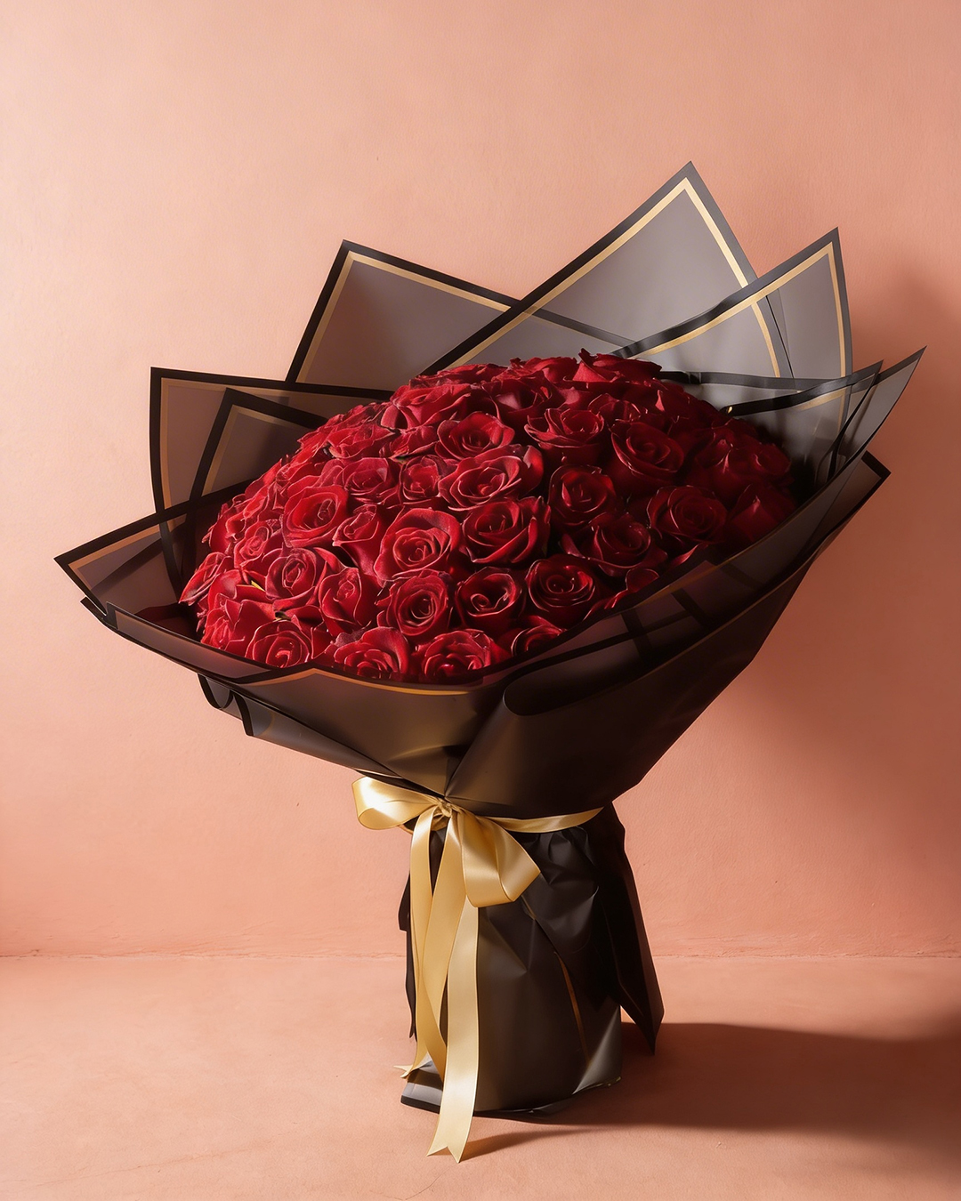 التغليف يعتمد على ورق شفاف أسود بطبقات هندسية عصرية تحيط بالباقة وتبرزها بشكل درامي أنيق، مع شريطة ساتان ذهبية تضيف لمسة ملكية راقية وتوازن بصري جذاب.