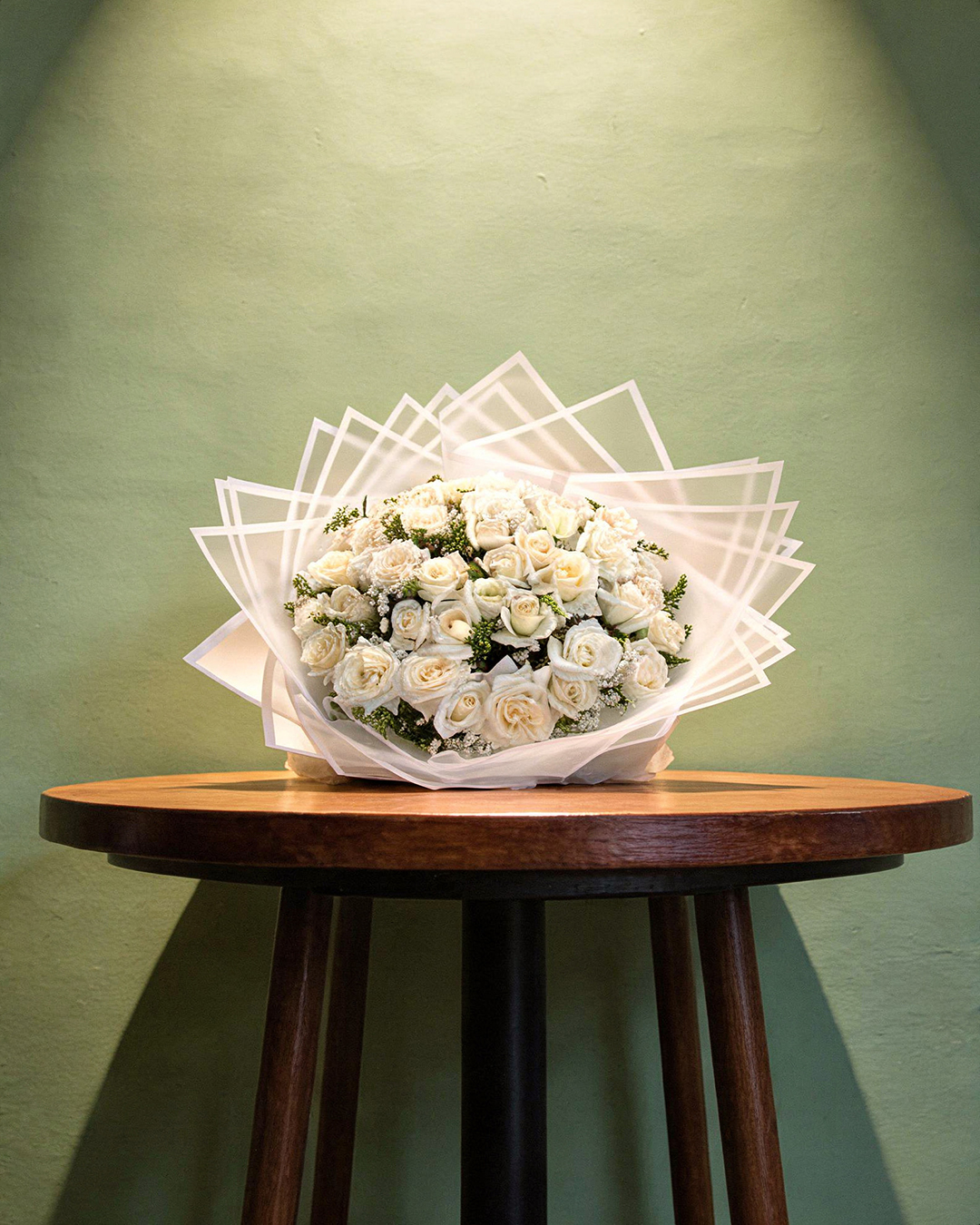 الباقة تحتوي على ورد أبيض طبيعي مرتب بكثافة في شكل دائري ممتلئ، مع إضافات من الجبسوفيلا ولمسات خضراء خفيفة لإبراز جمال اللون الأبيض.