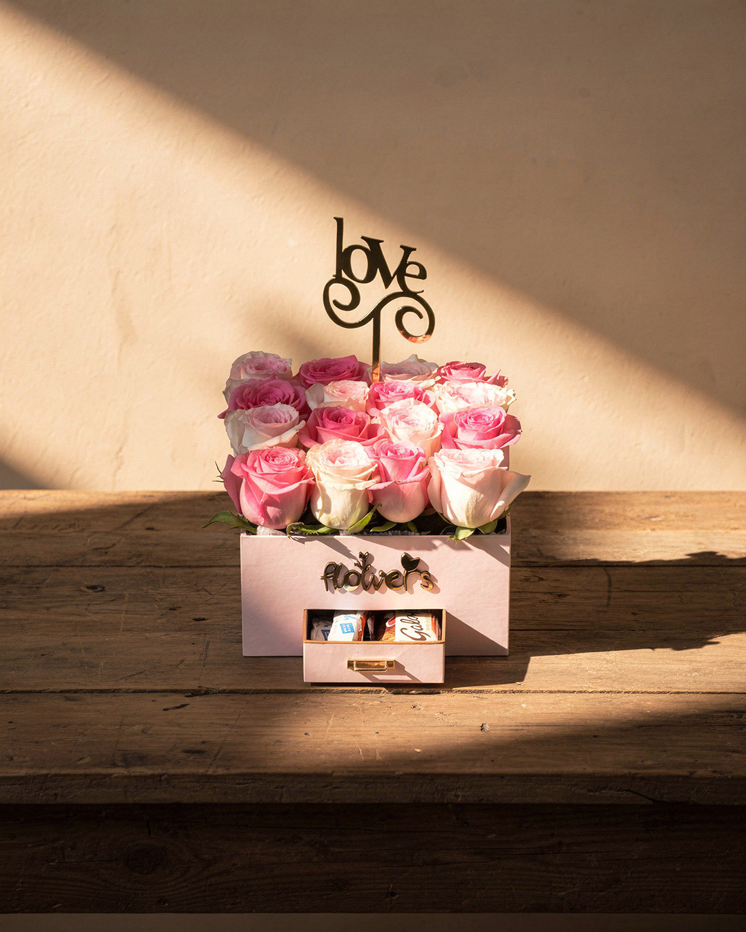 مرفق توبّر كلمة Love باللون الذهبي لإكمال الطابع الرومانسي، مع إمكانية إضافة رسالة خاصة.